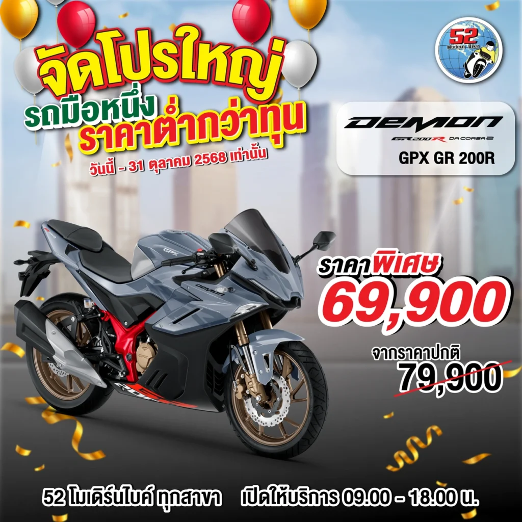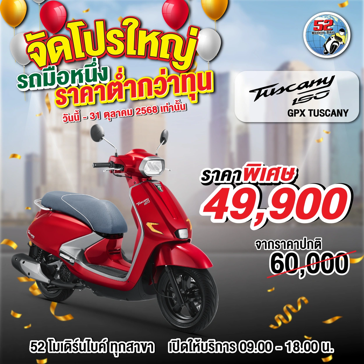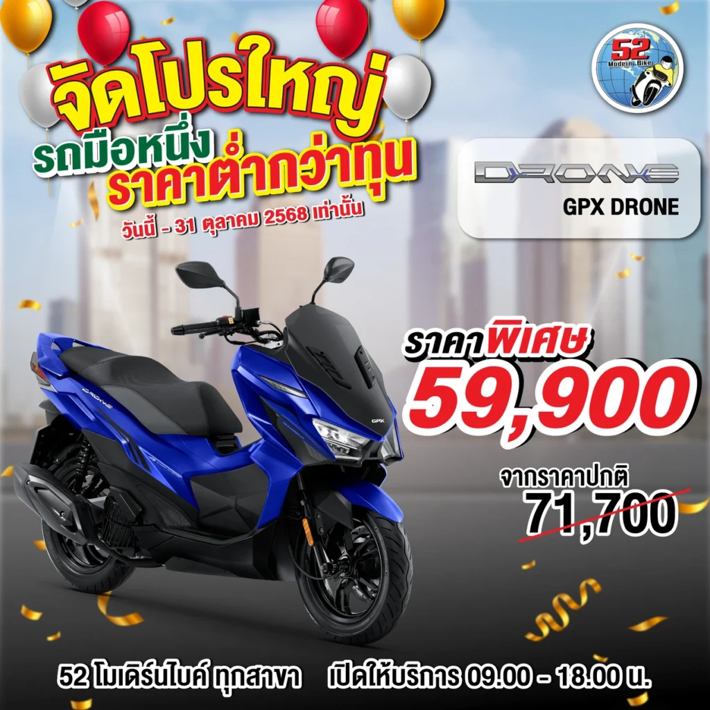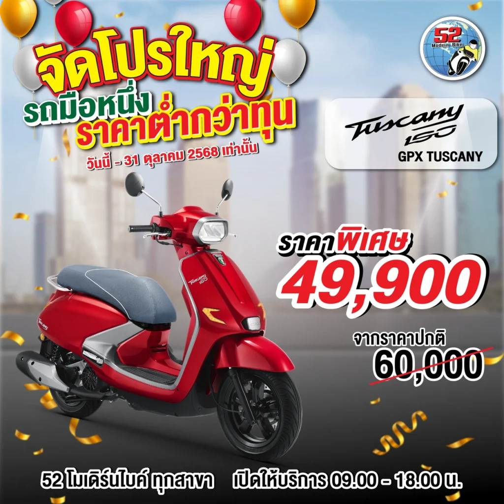 รุ่นที่จัดโปรโมชั่น DRONE, DEMON, TUSCANY150, ROCK, POPZ, LEGEND GENTLEMAN สอบถามได้ที่ 52 โมเดิร์นไบค์ทุกสาขา เปิดให้บริการ 09.00-18.00 น.