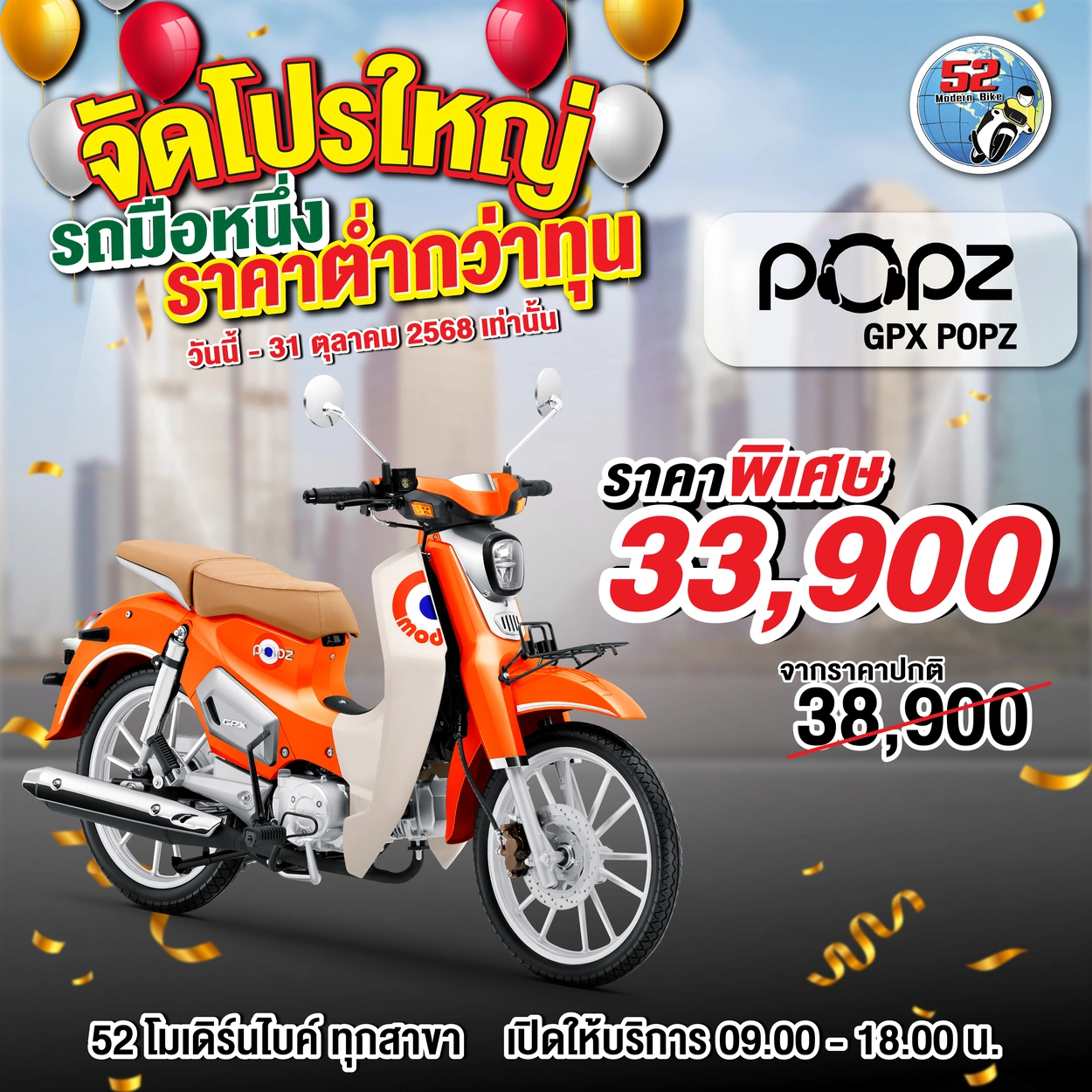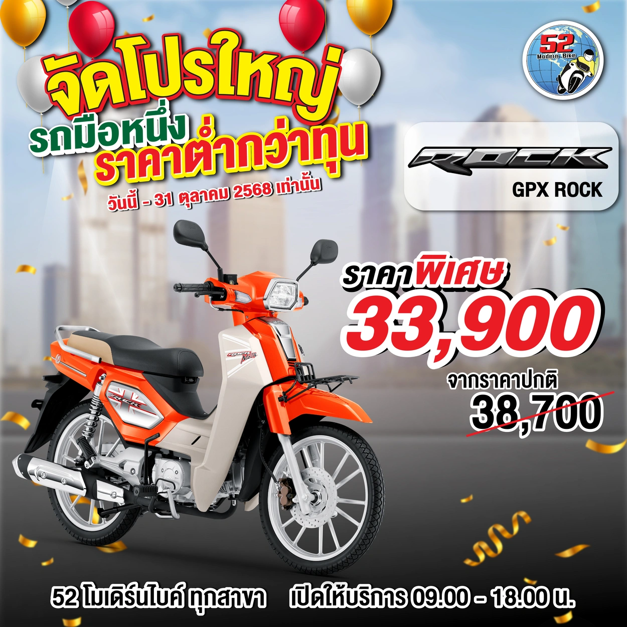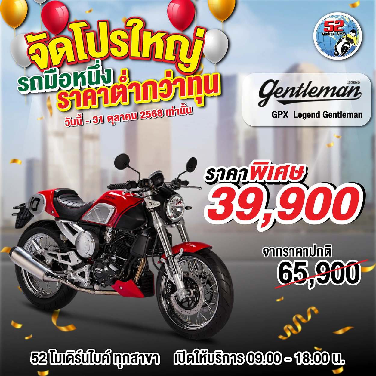 รุ่นที่จัดโปรโมชั่น DRONE, DEMON, TUSCANY150, ROCK, POPZ, LEGEND GENTLEMAN สอบถามได้ที่ 52 โมเดิร์นไบค์ทุกสาขา เปิดให้บริการ 09.00-18.00 น.