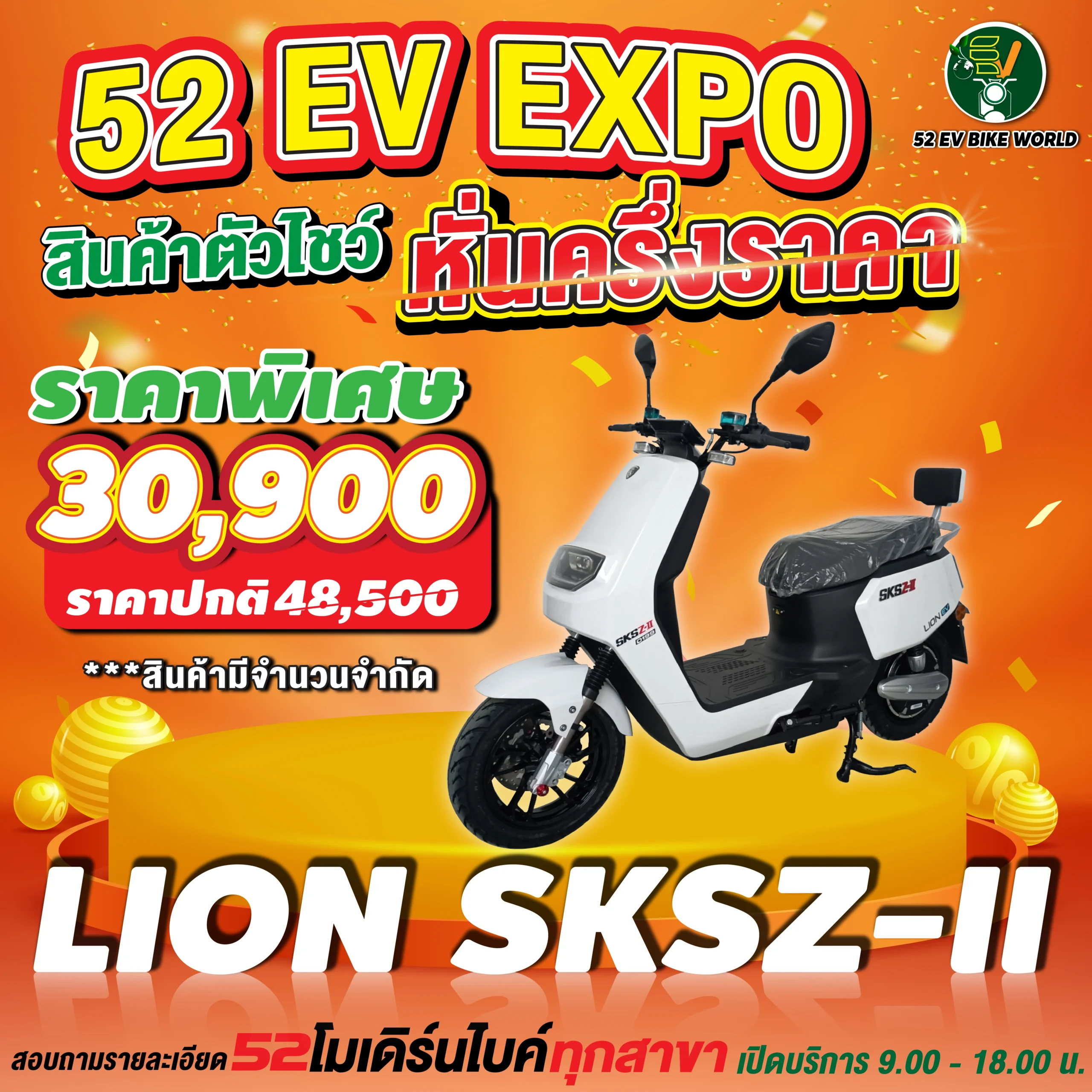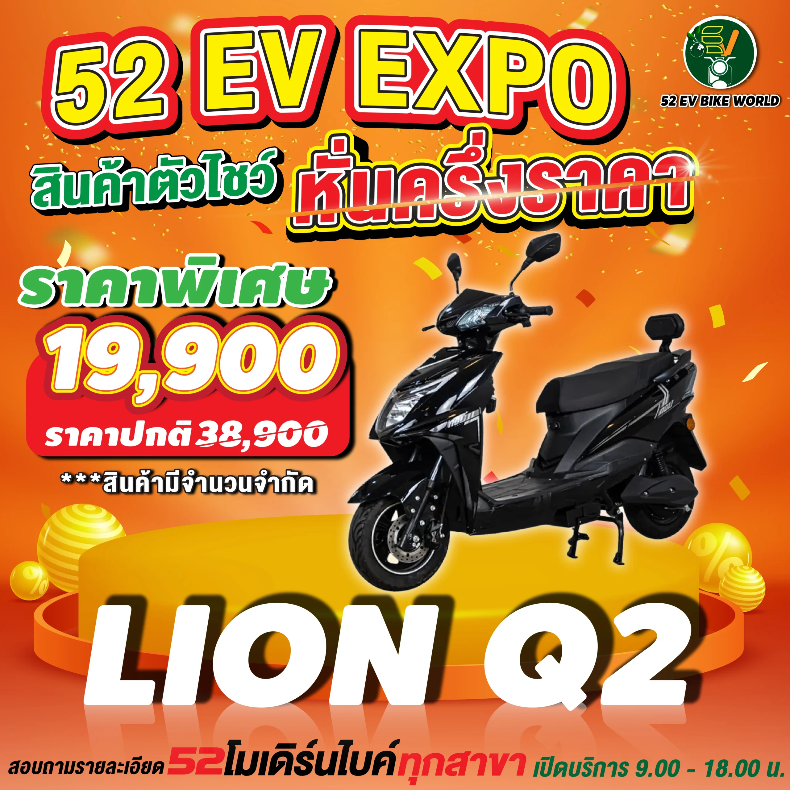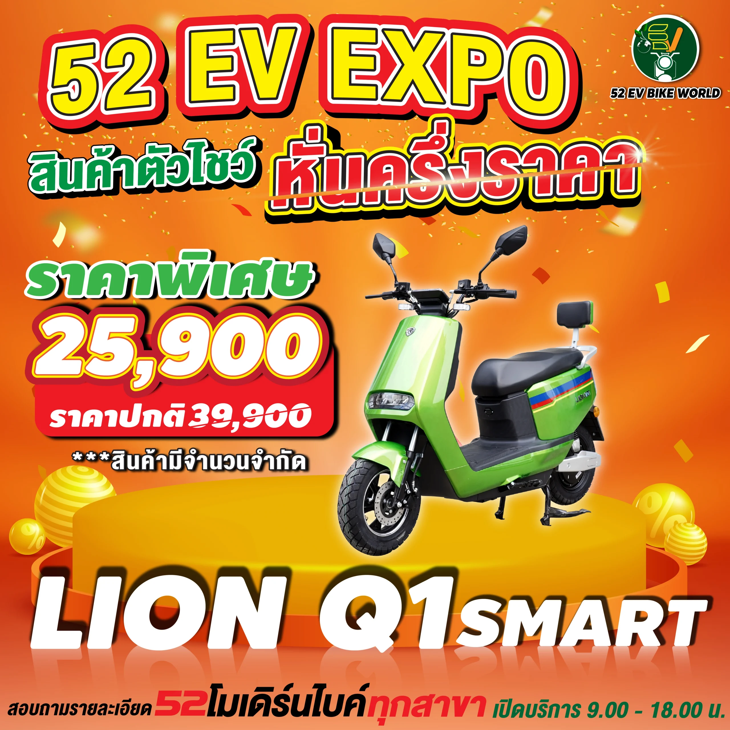 สินค้าตัวโชว์รถมอเตอร์ไซค์ไฟฟ้า หั่นครึ่งราคา สอบถามรายละเอียดได้ที่ 52 โมเดิร์นไบค์ทุกสาขา เปิดให้บริการ 09.00-18.00 น.