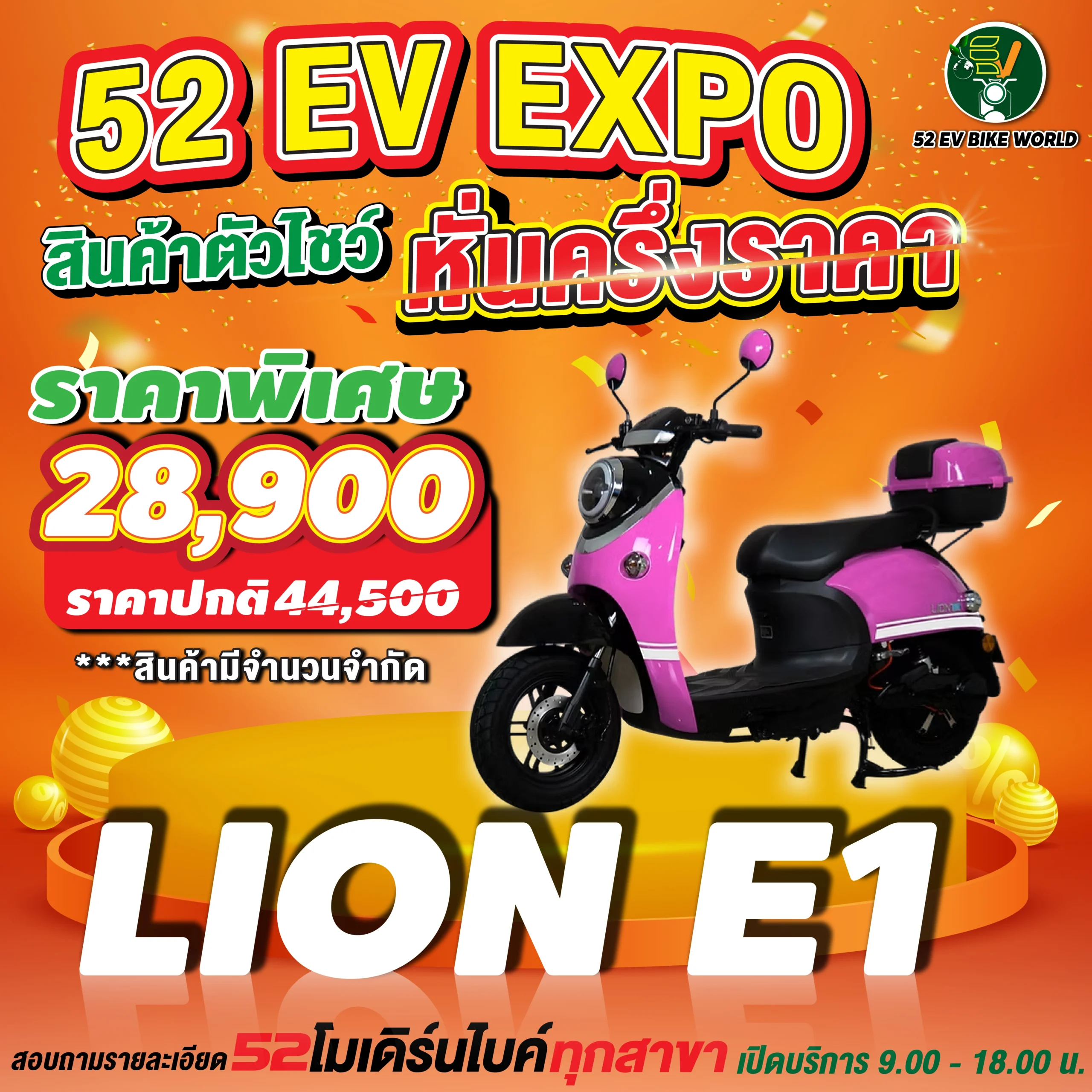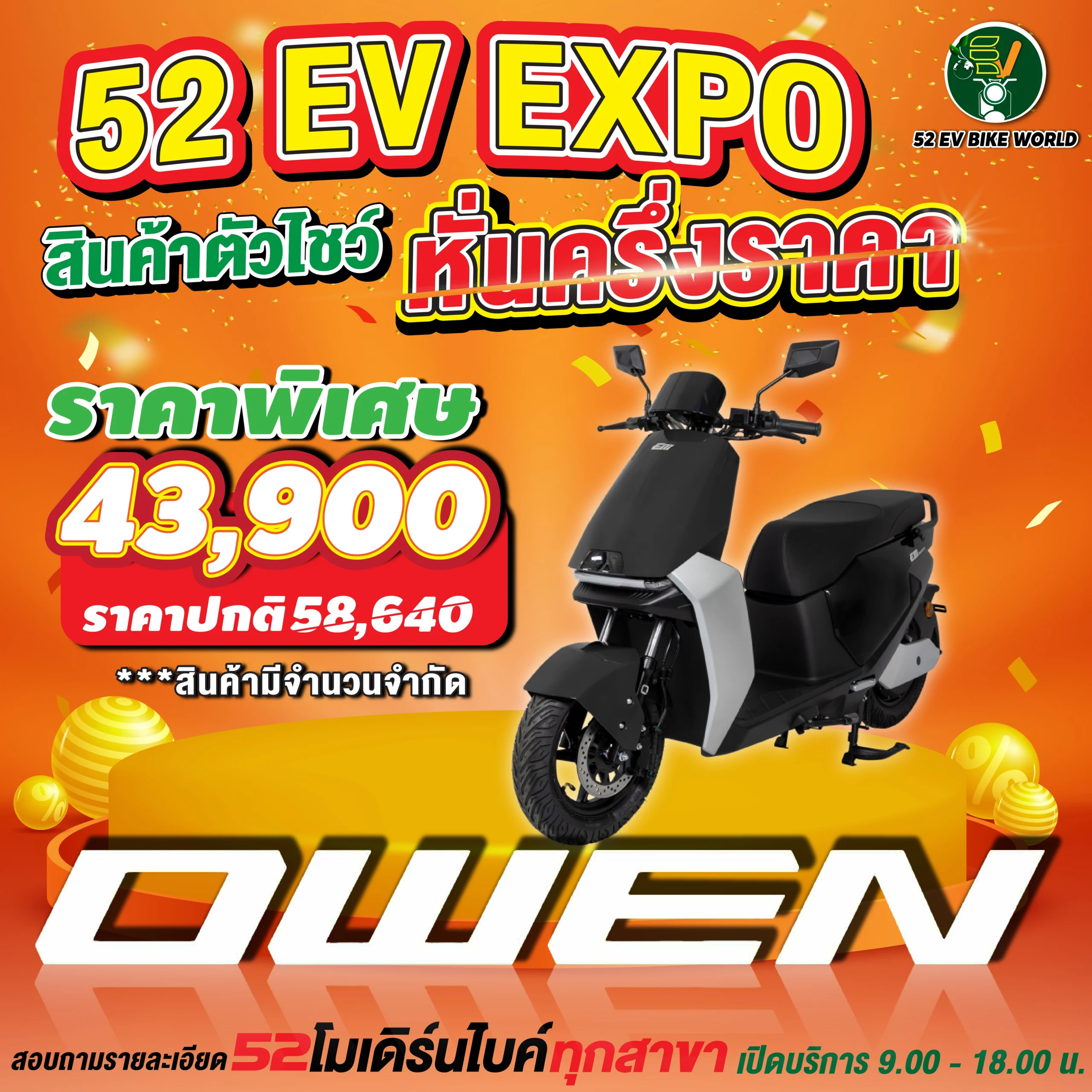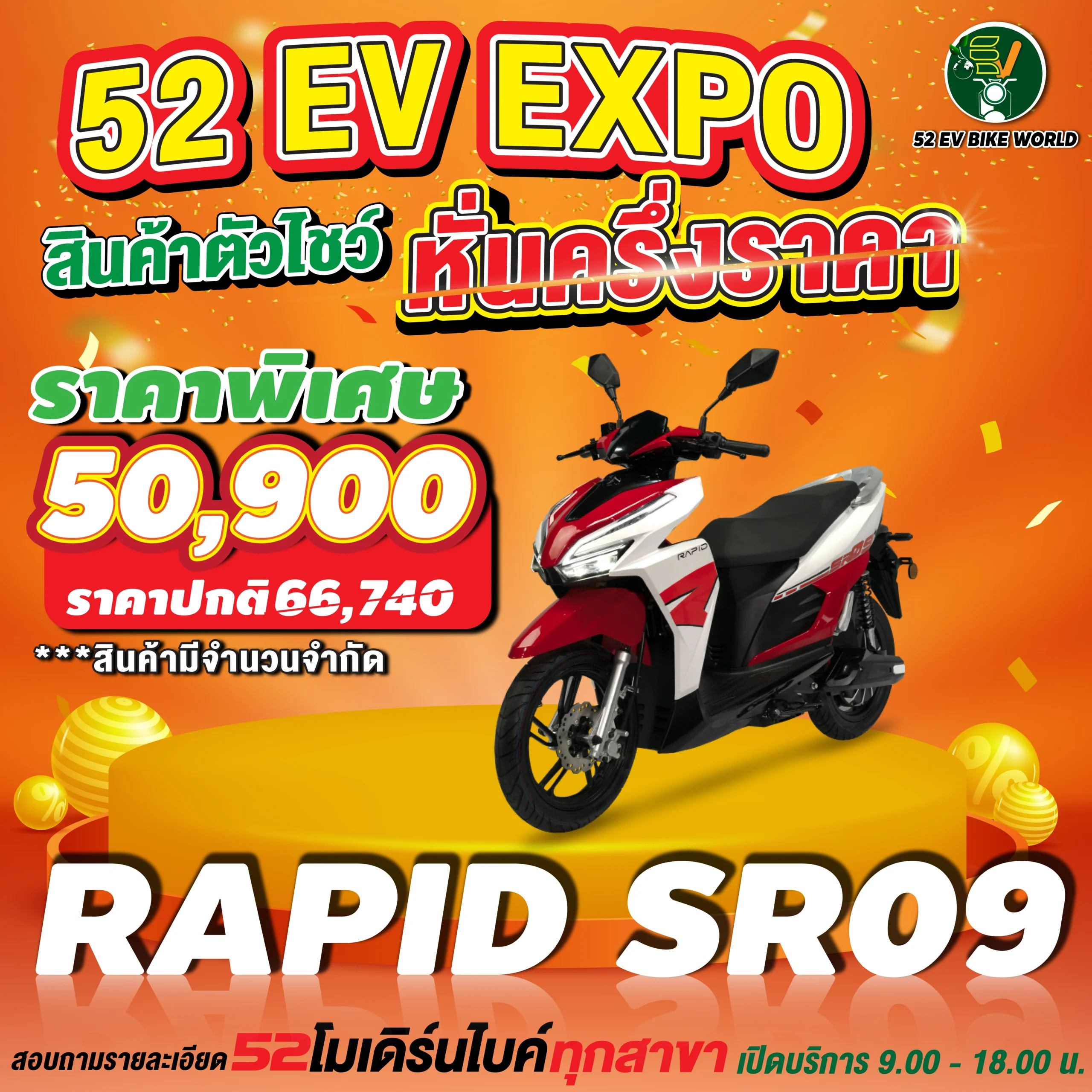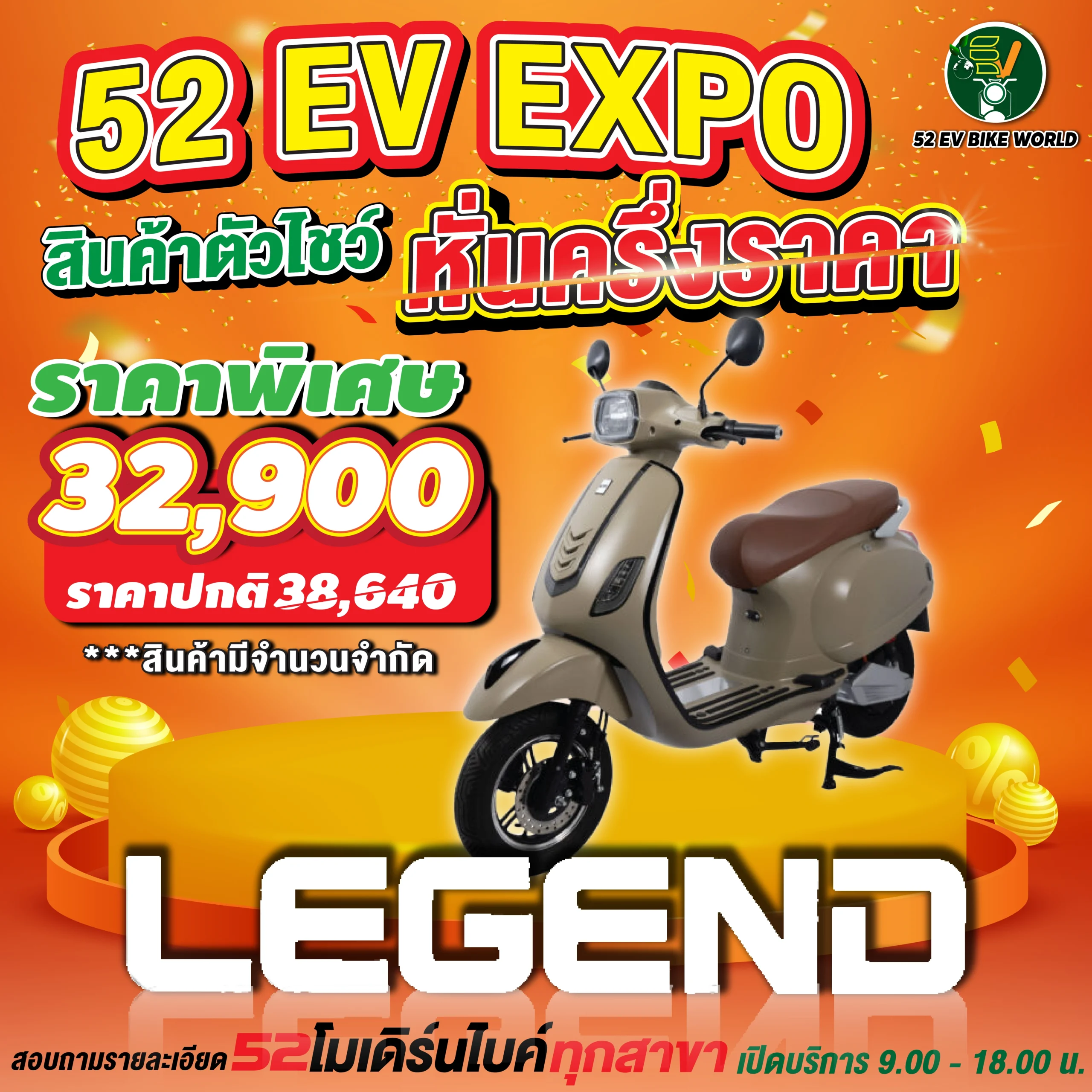 สินค้าตัวโชว์รถมอเตอร์ไซค์ไฟฟ้า หั่นครึ่งราคา สอบถามรายละเอียดได้ที่ 52 โมเดิร์นไบค์ทุกสาขา เปิดให้บริการ 09.00-18.00 น.